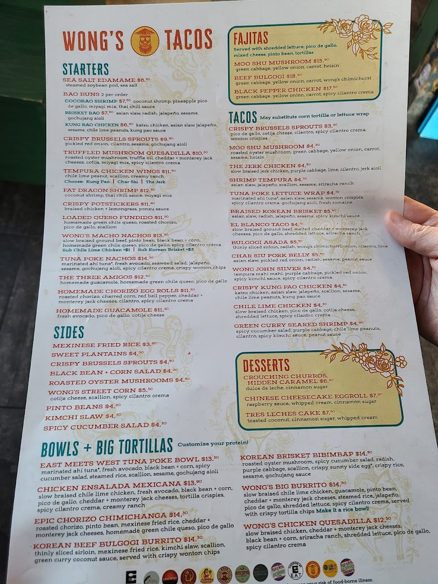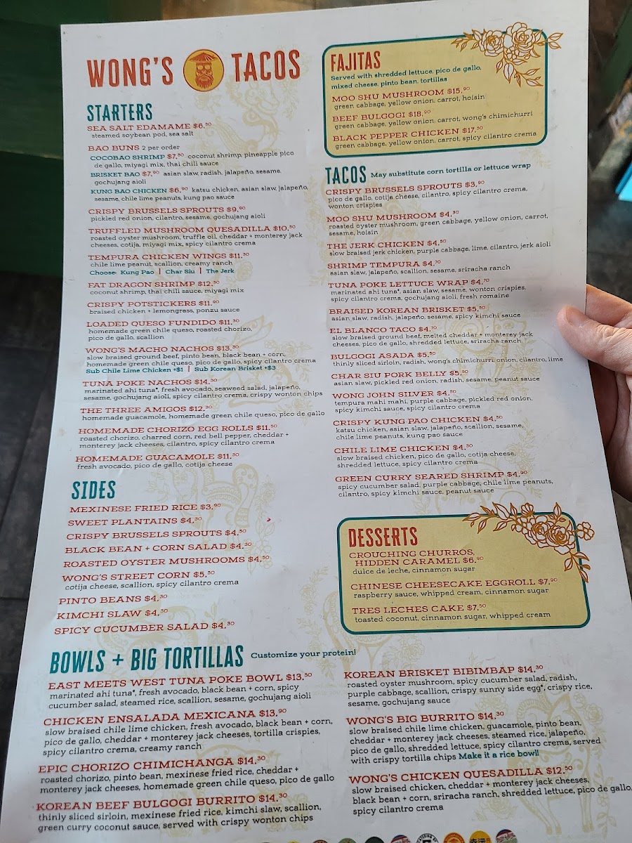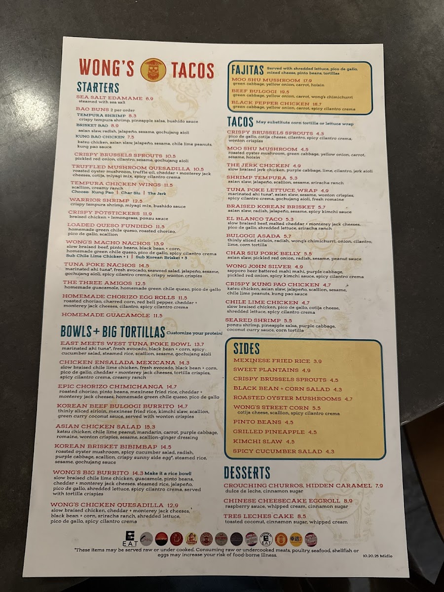 As a final impression, the menu at Wong's Tacos - Midlothian, located at 1106 Winterfield Crossing, feels like a confident and well-balanced celebration of Asian-Mexican fusion, offering something memorable in every category. The starters set the tone with crowd-pleasers like Sea Salt Edamame, Crispy Brussels Sprouts, Truffled Mushroom Quesadilla, Tempura Chicken Wings, and Warrior Shrimp, blending comfort and bold flavor. The Bao Buns-including Tempura Shrimp, Brisket Bao, and Kung Bao Chicken-are soft, rich, and satisfying, while the Fajitas such as Moo Shu Mushroom, Beef Bulgogi, and Black Pepper Chicken deliver hearty, sizzling appeal.