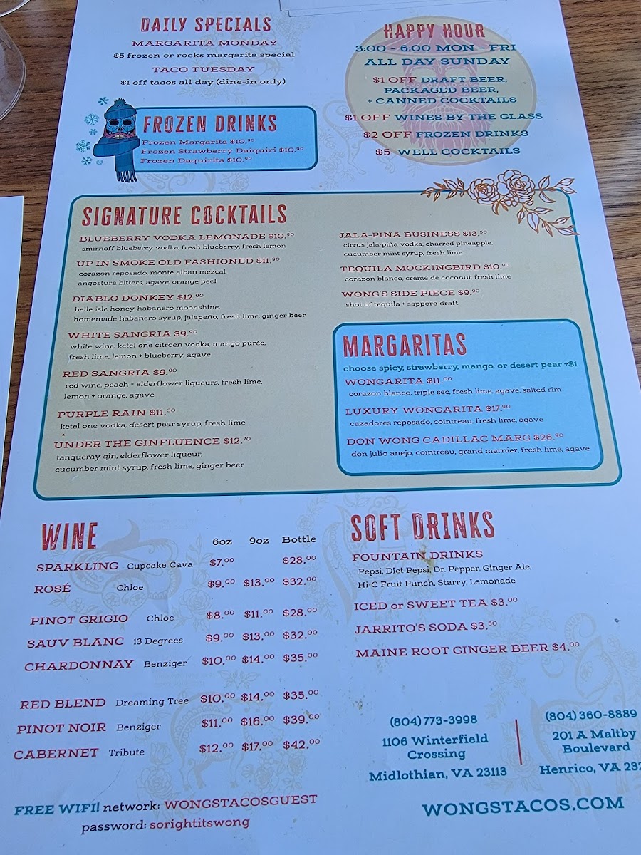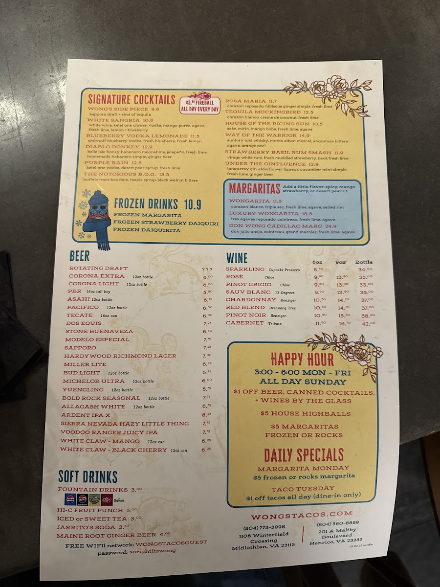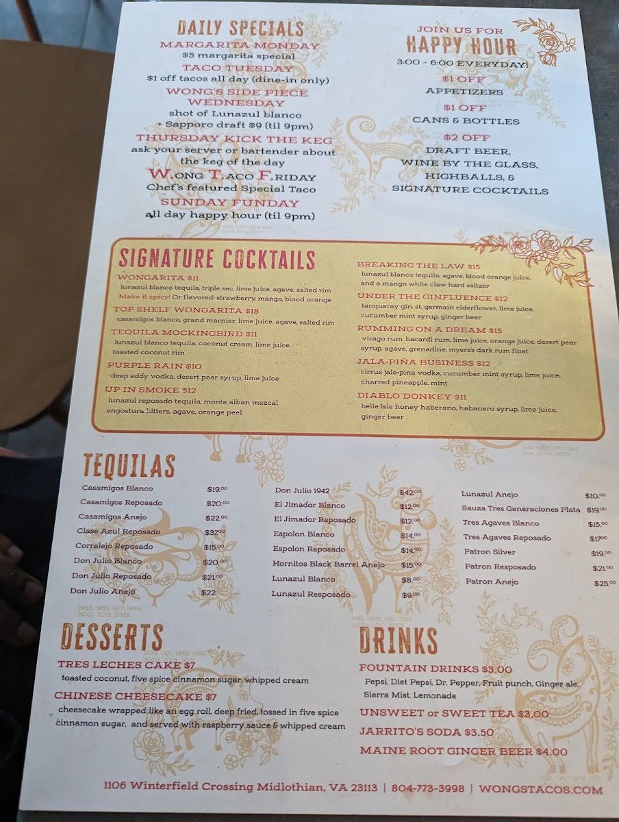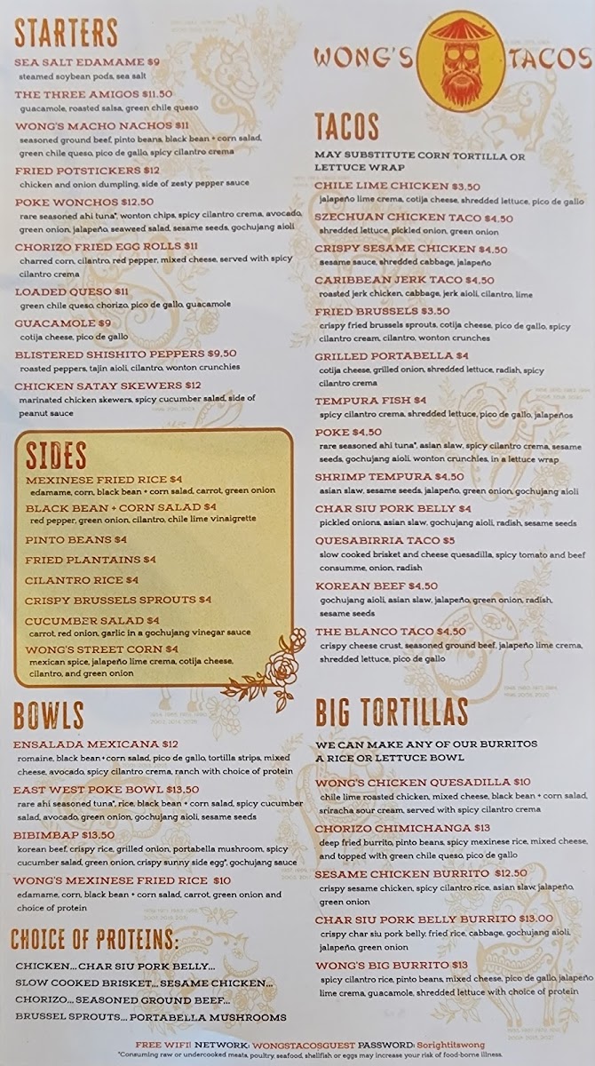 As a final impression, the menu at Wong's Tacos - Midlothian, located at 1106 Winterfield Crossing, feels like a confident and well-balanced celebration of Asian-Mexican fusion, offering something memorable in every category. The starters set the tone with crowd-pleasers like Sea Salt Edamame, Crispy Brussels Sprouts, Truffled Mushroom Quesadilla, Tempura Chicken Wings, and Warrior Shrimp, blending comfort and bold flavor. The Bao Buns-including Tempura Shrimp, Brisket Bao, and Kung Bao Chicken-are soft, rich, and satisfying, while the Fajitas such as Moo Shu Mushroom, Beef Bulgogi, and Black Pepper Chicken deliver hearty, sizzling appeal.