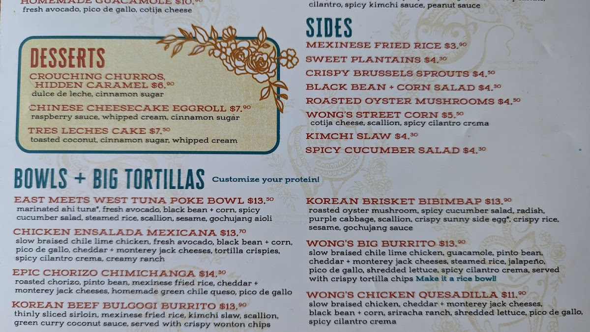The taco selection stands out with creative options like Crispy Brussels Sprouts, Moo Shu Mushroom, The Jerk Chicken, Shrimp Tempura, and Tuna Poke Lettuce Wrap, showing versatility beyond traditional fillings. Larger plates shine in Bowls + Big Tortillas, especially East Meets West Tuna Poke Bowl, Chicken Ensalada Mexicana, Epic Chorizo Chimichanga, Korean Beef Bulgogi Burrito, and Asian Chicken Salad. Thoughtful sides such as Mexinese Fried Rice, Sweet Plantains, Black Bean + Corn Salad, and Roasted Oyster Mushrooms complement the meal perfectly. Finally, desserts like Crouching Churros, Hidden Caramel, Chinese Cheesecake Eggroll, and Tres Leches Cake provide a sweet and satisfying close. Overall, the menu feels cohesive, adventurous, and clearly designed to leave a lasting impression.